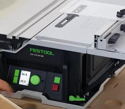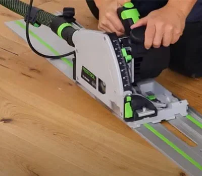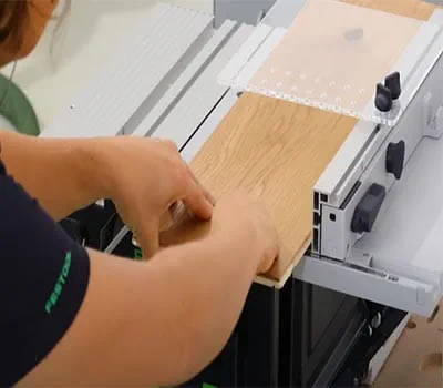 Kitame žingsnyje nustatomas pjovimo gylis. Kad pjūklo dantukai nesubraižytų išlyginamojo grindų sluoksnio, nustatomas grindų dangos aukštis, t. y. lentos aukštis (šiame pavyzdyje 15 mm). Nustatymui naudokite kreipiančiosios liniuotės žymą (įskaičiuotas kreipiančiosios liniuotės storis). Nepamirškite prijungti dulkių siurblio!