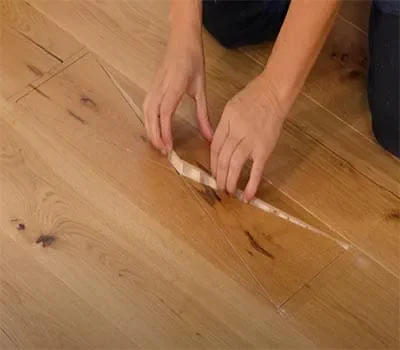 Taisomos medinių grindų lentos pirmiausia įpjaunamos įstrižai nuo parketlenčių sudūrimo vietos. Kadangi kreipiančioji liniuotė ant grindų negali būti prispaudžiama, jai nenuslysti padeda kreipiančiosios liniuotės lipukai.