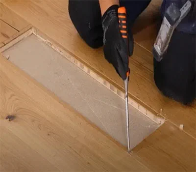 Pirmiausia įstrižai pjaukite grindų lentą, kad būtų galima ją nuimti.