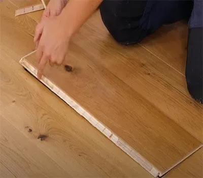Dabar patikrinkite, ar viskas sutampa. Jei lenta visiškai įsistato, klojant plaukiojančiu būdu įlaidos ir išdrožos sutepamos klijais, o klijuojant visą plokštumą, grindys patepamos parketui skirtais klijais. Paskui galima įdėti kitą lentą. Paskui viską reikėtų prispausti.
