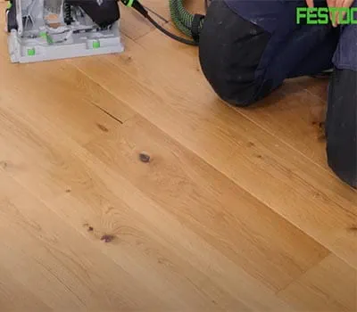 Kad būtų galima įdėti naują medinę grindų lentą iš viršaus, nupjaunama tik apatinė išdrožos iškyša. Šiame pavyzdyje pjovimo aukštis – 6,8 mm.